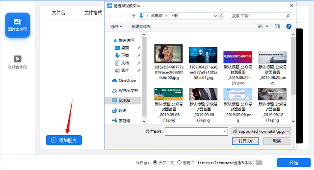 3、在去照片水印之前先将需要的照片选择好,点击“添加图片”按钮进行照片的选择,可选择多张照片。