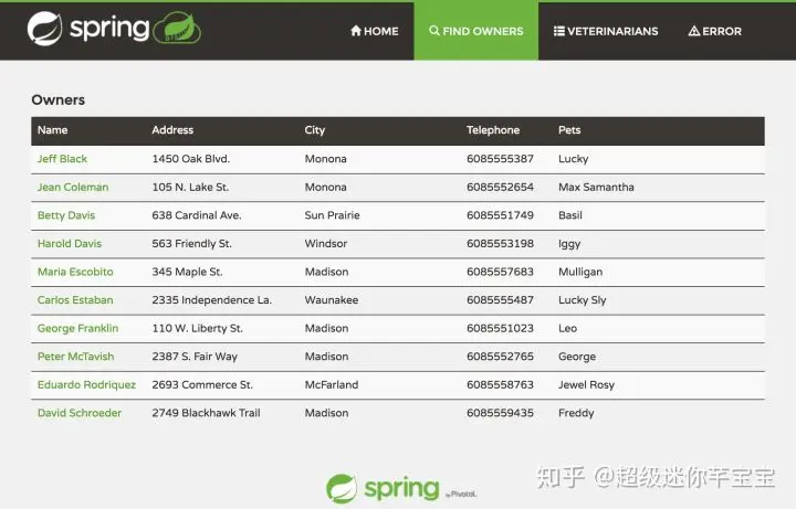 2019-09-11 01:58:23.158 INFO 1 --- [ main] o.s.s.petclinic.PetClinicApplication : Started PetClinicApplication in 7.458 seconds (JVM running for 8.187)可以通过 http://localhost:8080/ 访问应用界面。