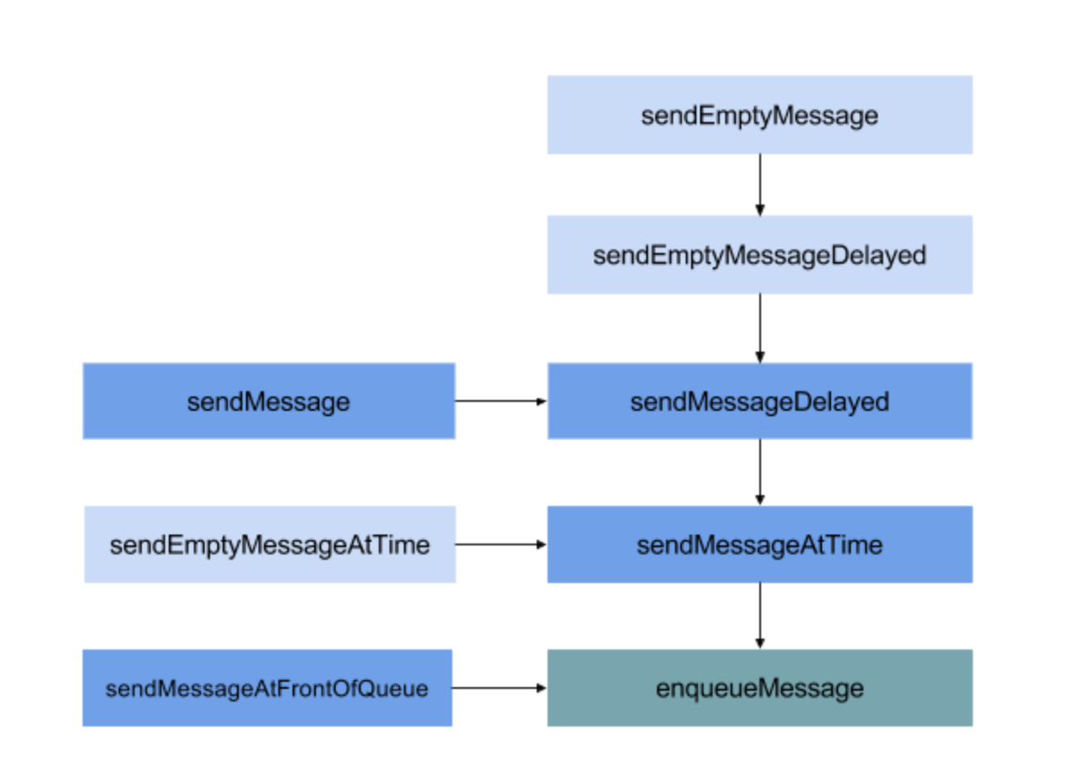 - Handler通过sendMessage方法发送消息,插入到MessageQueue