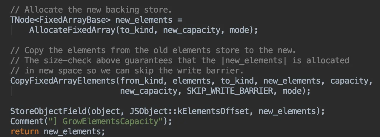 快速的后备存储结构是 FixedArray ,并且数组长度 <= elements.length();