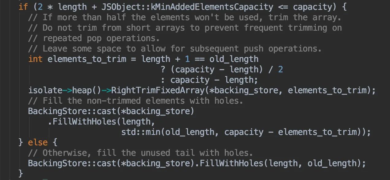 可以看出收缩数组的判断是: 如果容量 >= length的2倍 + 16,则进行收缩容量调整,否则用holes对象(什么事holes对象?下面来解释)填充未被初始化的位置。