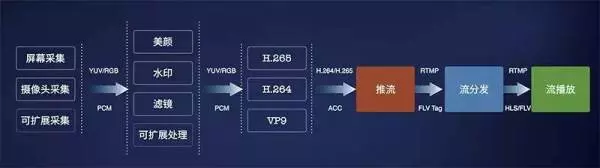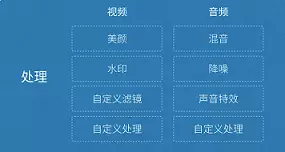 如上图所示,处理环节中分为音频和视频处理,音频处理中具体包含混音、降噪和声音特效等处理,视频处理中包含美颜、水印、以及各种自定义滤镜等处理。