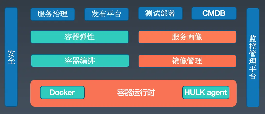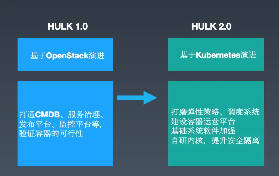 HULK平台包含容器以及弹性调度系统,容器可以统一运行环境、提升交付效率,而弹性调度可以提升业务的资源利用率。在漫威里有个叫HULK的英雄,在情绪激动的时候会变成“绿巨人”,情绪平稳后则恢复人身,这一点跟我们容器的”弹性伸缩“特性比较相像,所以我们的系统就取名为”HULK“。