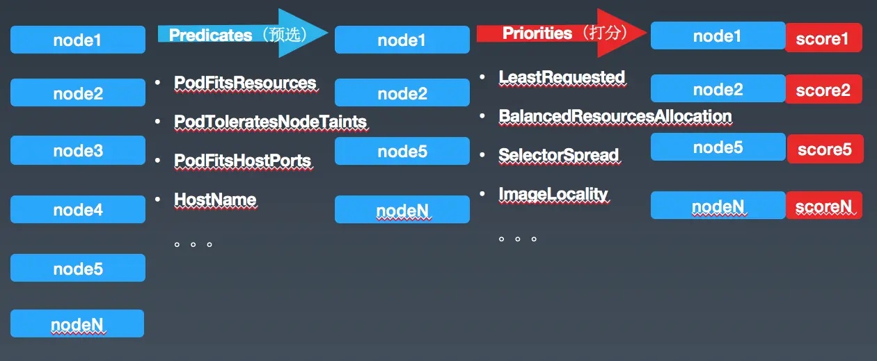 Predicates 预选阶段(一堆的预选条件):PodFitsResources检查是否有足够的资源(比如CPU、内存)来满足一个Pod的运行需求,如果不满足,就直接过滤掉这个Node。