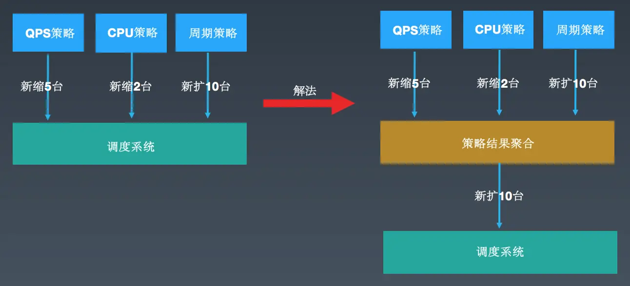 早期的设计是各条策略独自决策,扩容顺序有可能是:缩5台、缩2台、扩10台,也有可能是:扩10台、缩5台、缩2台,就可能造成一些无效的扩缩行为。