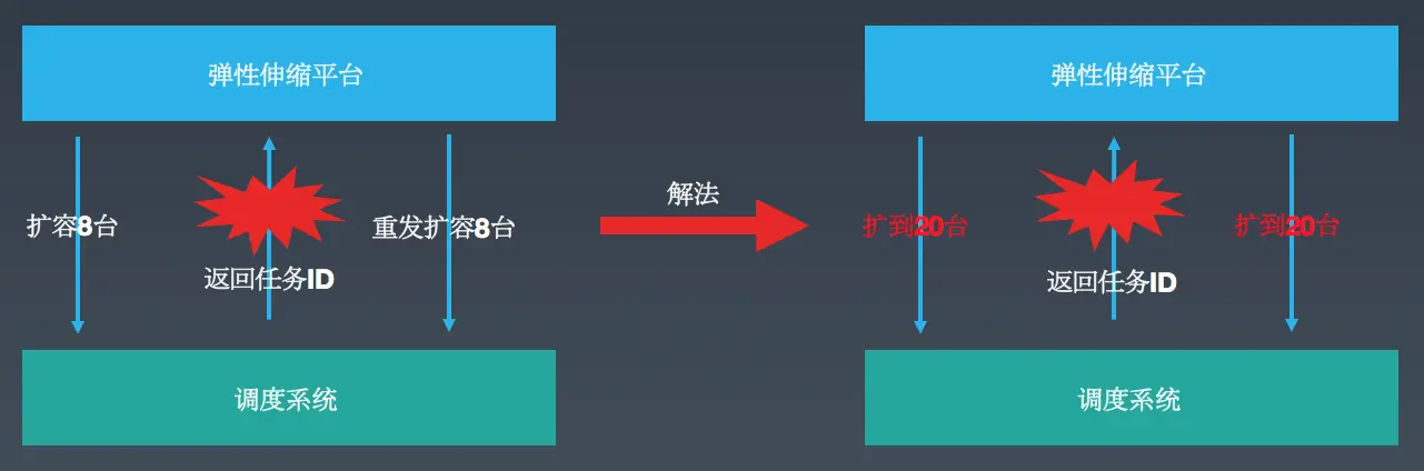 如上图所示,聚合层发起具体扩缩容的时候,因之前采用的是增量扩容方式,在一些场景下会出现频繁扩缩现象。比如,原先12台,这个时候弹性伸缩平台告诉调度系统要扩容8台,在返回TaskId的过程中超时或保存TaskId失败了,这个时候弹性伸缩平台会继续发起扩容8台的操作,最后导致服务下有28台实例(不幂等)。