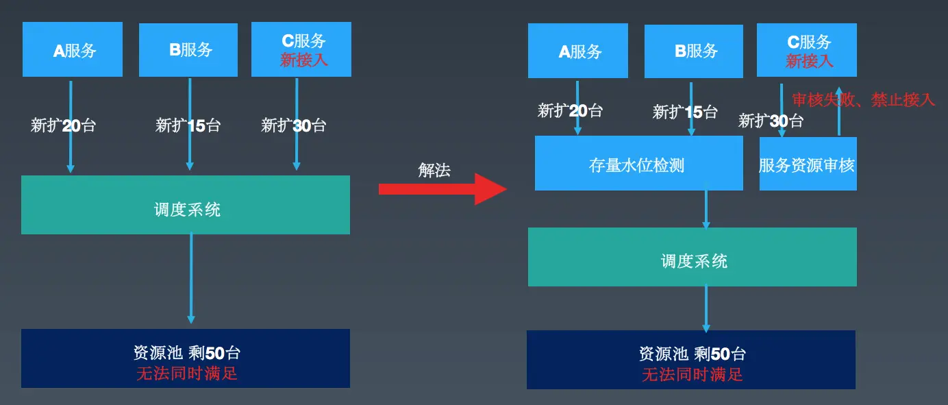 如上图所示,存量中有2个服务,一个需要扩容20台,一个需要扩容15台,这个时候如果新接入一个服务,同一时间需要扩容30台,但是资源池只剩余50台实例了。这个时候就意味着,谁先扩容谁就可以获得资源保障,后发起的请求就无法获得资源保障。