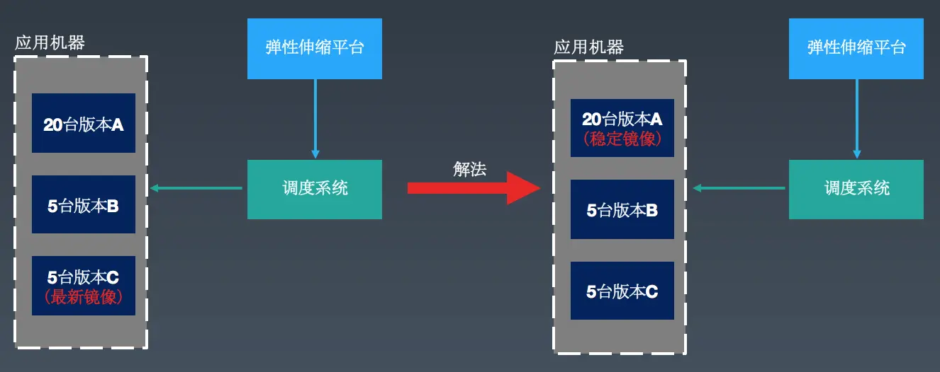 如上图所示,一个业务线上有30台机器,存在3个版本(A、B、C)。之前我们弹性扩容的做法是采用业务构建的最新镜像进行扩容,但在实际生产环境运行过程中却遇到问题。比如一些业务构建的最新镜像是用来做小流量测试的,本身的稳定性没有保障,高峰期扩容的时候会提升这个版本在线上机器中的比例,低峰期的时候又把之前稳定版本给缩容了,经过一段时间的频繁扩缩之后,最后线上遗留的实例可能都存在问题。
