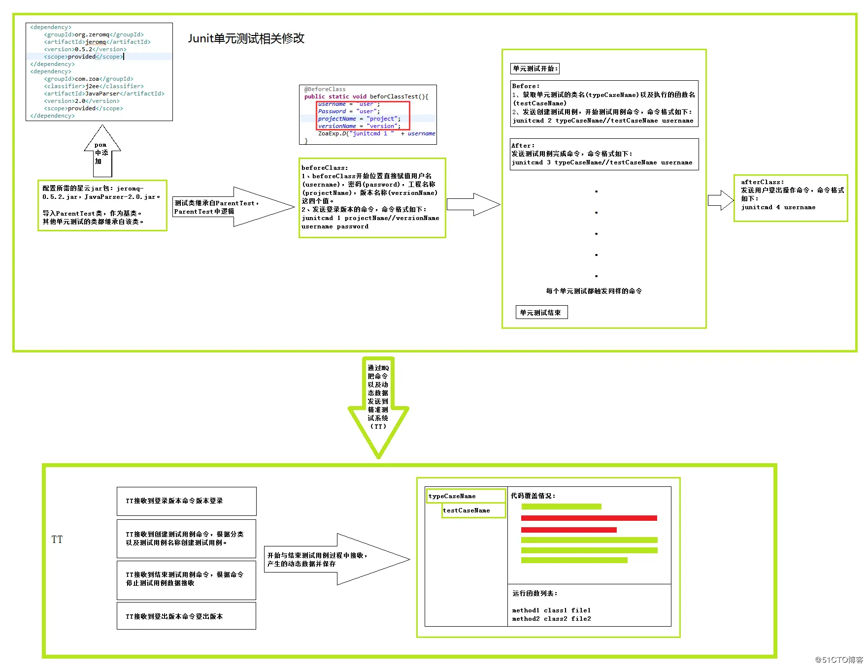 下图是精准测试与Junit单元测试无缝对接实现自动化测试的架构示意图。