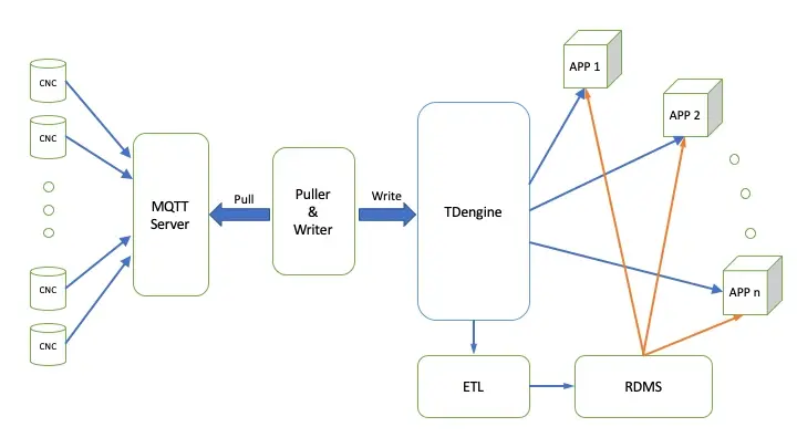 采集器采集的数控机床的监控数据汇集到MQTT Server上。随后,数据轮询模块定期循环从MQTT Server上拉取数据,并转换为TDengine理解的SQL语句写入引擎。TDengine后面可接入各种应用程序,实时查询最新数据。少量的TDengine的配置信息等也会经过ETL模块转换写入一个关系型数据库,方便各个应用查询使用。