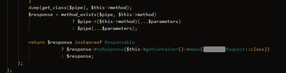 理解了array_reduce,然后我们看一下Laravel中carry()函数每次都返回了什么,打印一下每次调用的的 pipe 和 method: