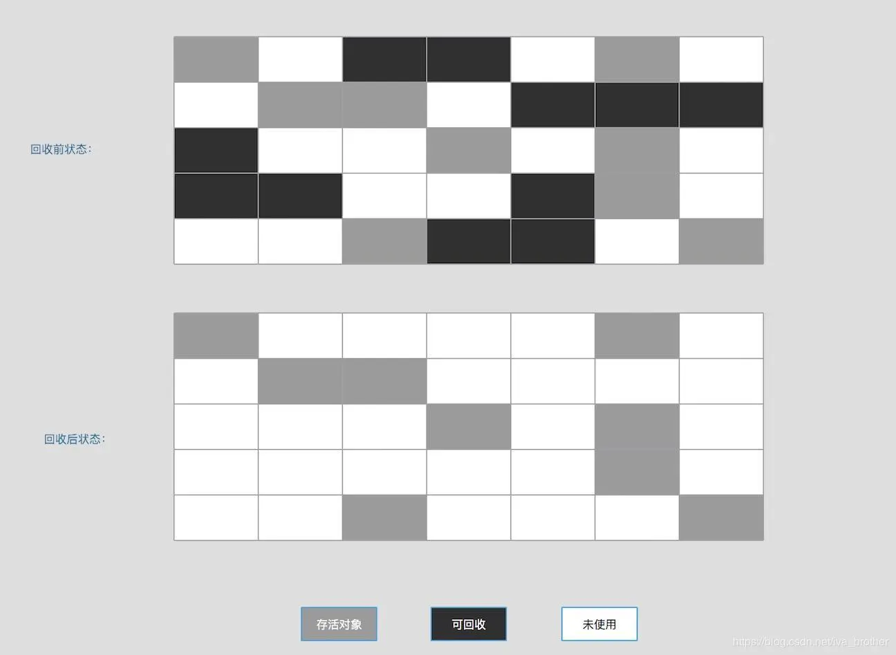 该算法分为标记和清除两个阶段。标记就是把所有活动对象都做上标记的阶段;清除就是将没有做上标记的对象进行回收的阶段。如下图所示。
