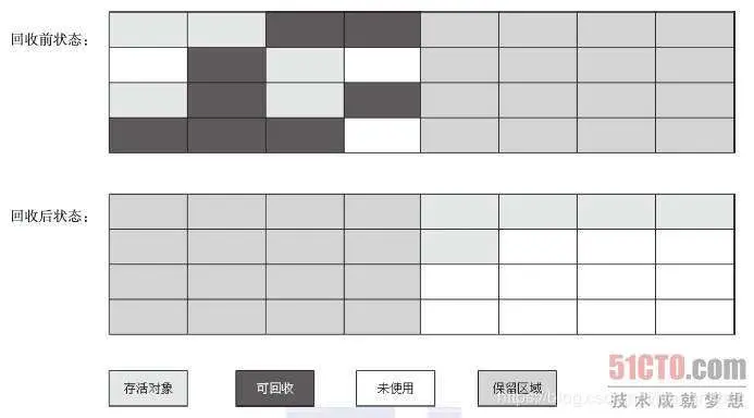 标记-压缩算法与标记-清理算法类似,只是后续步骤是让所有存活的对象移动到一端,然后直接清除掉端边界以外的内存。