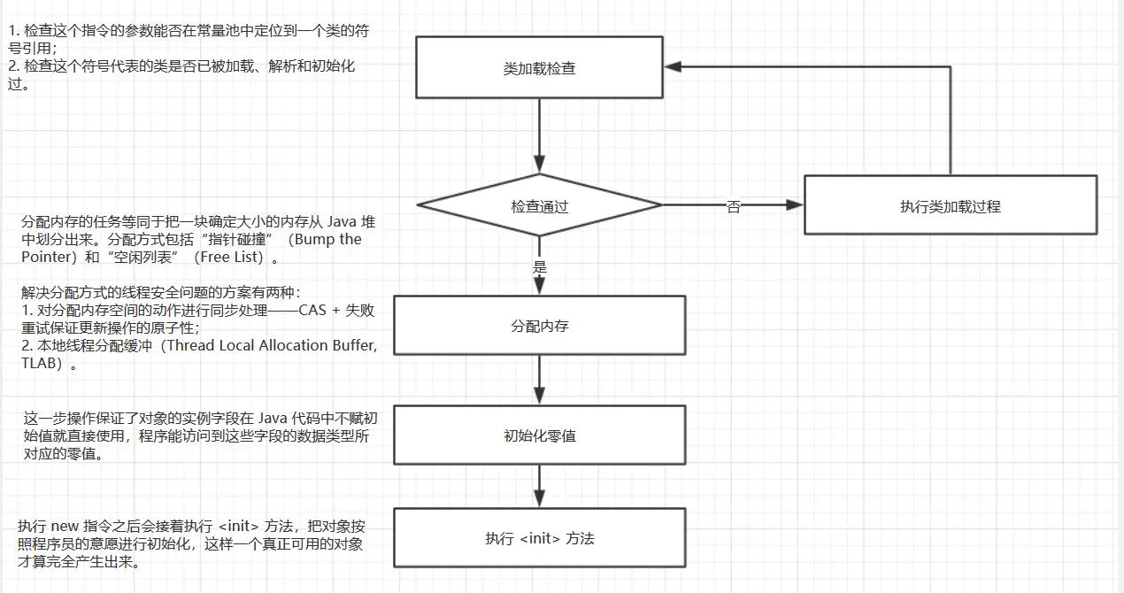 虚拟机遇到一条 new 指令时,首先进行类加载检查。检查这个指令的参数能否在常量池中定位到一个类的符号引用,并且检查这个符号引用代表的类是否已被加载、解析和初始化过,如果没有,那必须先执行相应的类加载过程(之后的系列文章会介绍到)。