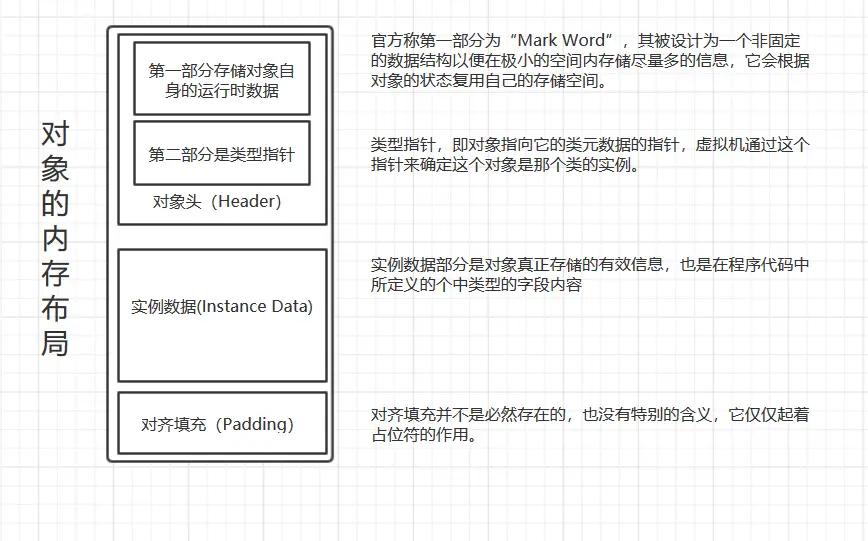 在虚拟机中,对象在内存中存储的布局可以分为 3 块区域:对象头(Header)、实例数据(Instance Data)和对齐填充(Padding)。