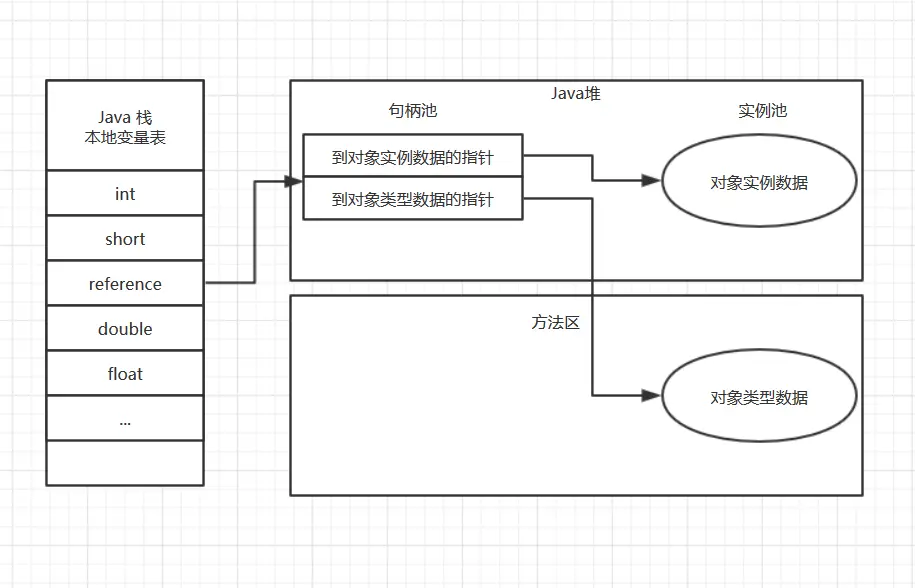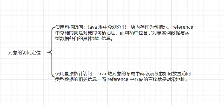 建立对象是为了使用对象,Java 程序需要通过栈上的 reference 数据来操作堆上的具体对象。由于 reference 类型在 Java 虚拟机规范中只规定了一个指向对象的引用,所以对象的访问方式也是取决于虚拟机实现而定的,目前主流的访问方式有 使用句柄 和 直接指针 两种。