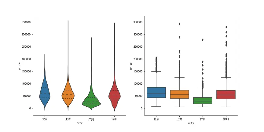 按城市分组,显示价格分布小提琴图和箱线图。