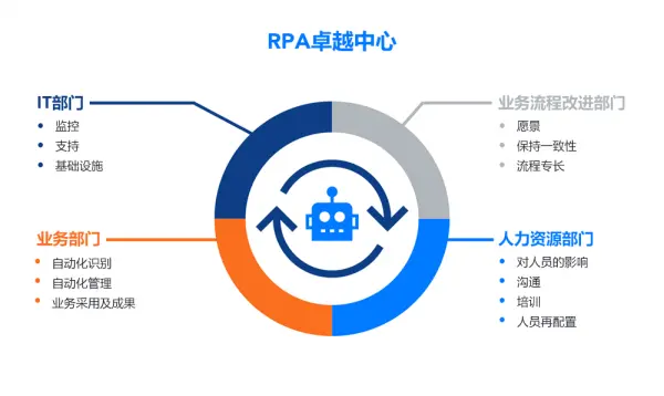 业务部门不仅需要积极寻找自动化机会,还需要负责对工具及流程变化进行引导和推广,让员工理解RPA对业务的价值所在。同时,业务部门也需要建立一套全新的变革管理方法,并对RPA实施进展进行监测。