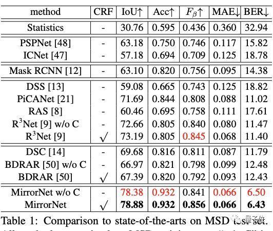研究人员采用了相关领域中常用的5个度量(即语义分割、显著目标检测和阴影检测) ,对镜子分割性能进行定量评估。