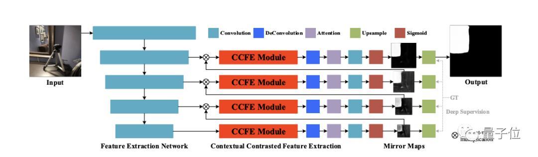 然后,将最深层的、语义丰富的特征输入到所提出的上下文对比特征提取(CCFE)模块中,学习上下文对比特征,通过检测对比出现的分界线,用初始的粗糙的镜子分割图来定位镜子。