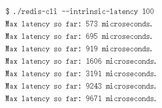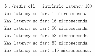 注意: redis-cli 在这个例子中需要运行在你运行 Redis 或者计划运行 Redis 的服务器上,而不是在客户端。在这个特殊模式下 redis-cli 根本不会连接 Redis 服务:它只是尝试测试内核不提供 CPU 时间去运行 redis-cli 进程自己的最大时长。