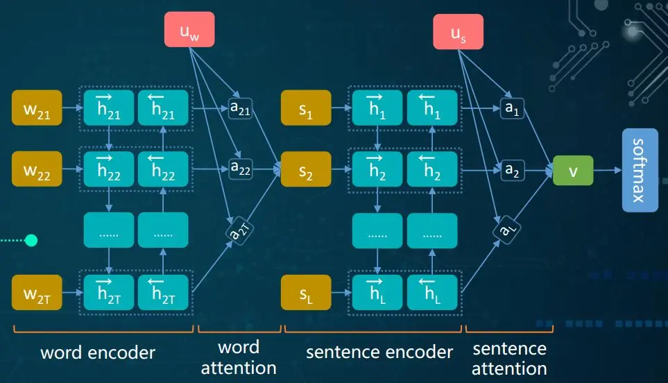 具体到算法模型,我们也先后比较许多方法,本质上我们认为标签识别模型是一个短文本分类算法,我们尝试了基于统计的方法(SVM, Random Forest, XgBoost),也尝试了基于神经网络的模型(FastText,Text CNN/RNN/RCNN, HAN),最终我们选择了HAN模型,也就是层次注意网络(Hierarchical Attention Network)模型,通过在词一级和句一级分别进行RNN和Attention计算,最终得到一个合理的文本向量表征,用于最后的分类,整个过程如图4所示。