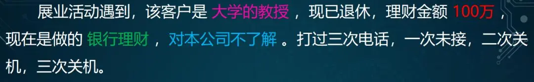 图2为一段客户陪访报告的节选,观察其文本特征,发现有许多业务所关注的信息,比如职业方面,客户是“大学教授”;在可投资产方面,理财金额有“100万”,投资类型是“银行理财”,对公司的态度是“不了解”等。