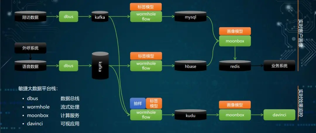 此外,在图6下方的数据流分支里,我们通过在Wormhole上流转的生产数据流进行一个选择性抽样,之后同样利用标签模型和画像模型,计算出客户画像,此后将原始数据、标签数据和客户画像通过Davinci展示给我们的模型维护人员,用于评估检查模型的运行情况,这样就实现了一个实时的模型效果监控系统。综合这两者,我们就得到了一个实时的、基于文本分析的画像构建系统。
