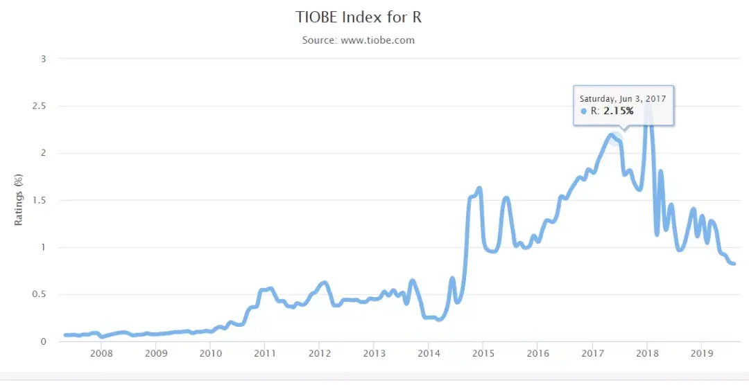 相比之下,近年来 R 在 TIOBE 排行榜上则节节败退不断受挫,从 2018 年 1 月的第 8 位下降到现在的第 20 位,快连 Perl、Swift 和 Go 都比不上了。巅峰时期的R,支持率约为 2.6%,现如今已降至 0.8%。