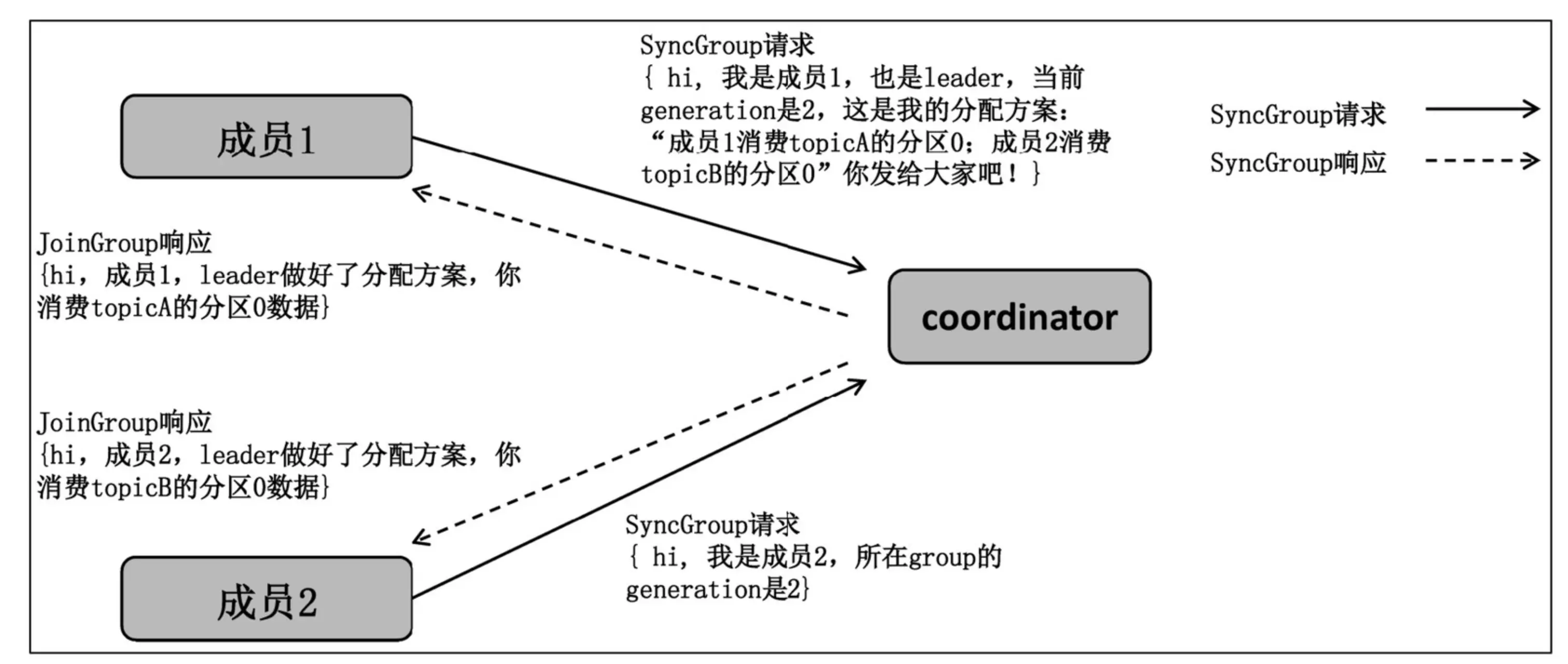 - SyncGroup请求:group leader把分配方案同步更新到组内所有成员中;