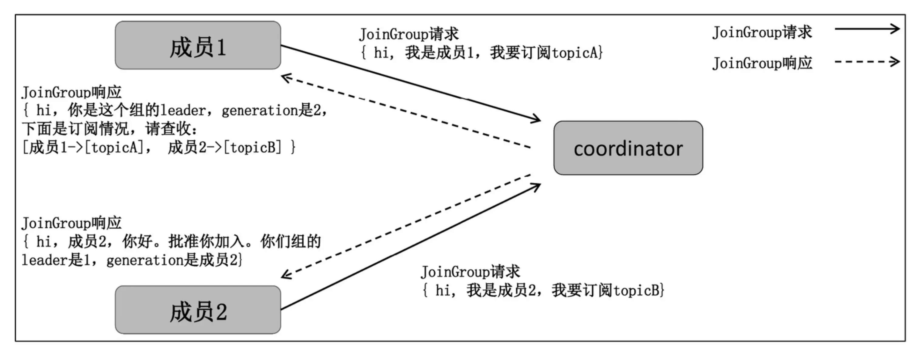 JoinGroup的请求,当coordinator收集全了JoinGroup的请求之后,coordinator就会选择一个consumer作为group的leader,并把所有的成员及其订阅信息发送给group的leader;leader接收到所有的信息之后,就开始计算分区分配方案,计算完成之后就会将计算结果封装到