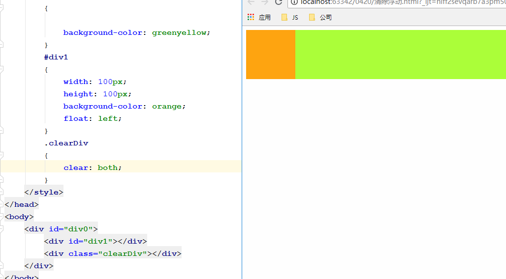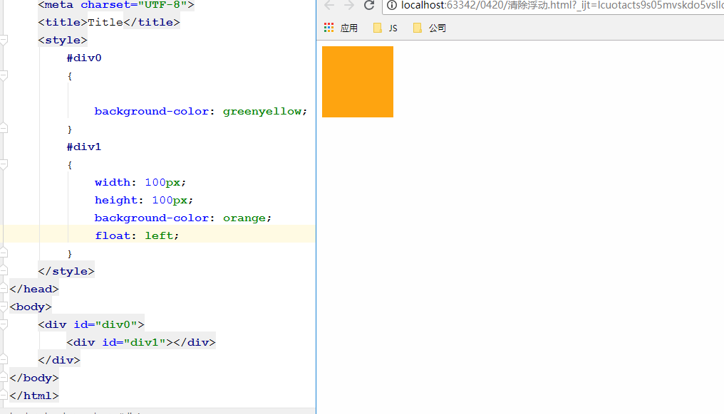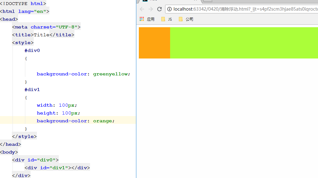 我们在这里设置了div0是外容器,div1是内部容器,div1因为设置了宽高是100,所以显示的时候就是一个橙色的100*100的方块,但是div0仅设置了背景色,因为div特有的独占一行,宽度会自动100%,高度被内部容器div1撑开了,撑开的高度是100像素,所有看到一个绿色高100像素,宽度100%的容器
