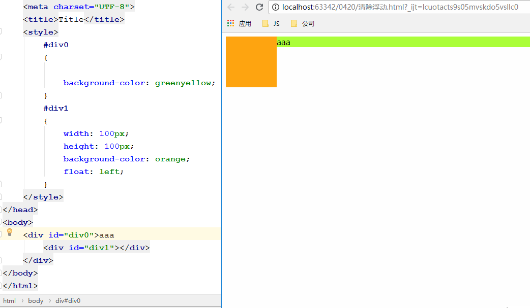 我们发现aaa这些文字出来了,环绕在橙色方块周围了,这个原因在浮动中我们已经讲解了,而且我们也发现绿色的容器也出来了,但是它的高度仅仅是文字的行高。这就说明,内部的橙色块设置浮动后,它的父级容器绿色块就不知道橙色容器的高度了,因此绿色容器的高度变成了0,写入文字后,绿色容器重新被撑开高度才可以看到。我们把这种情况称为高度塌陷。
