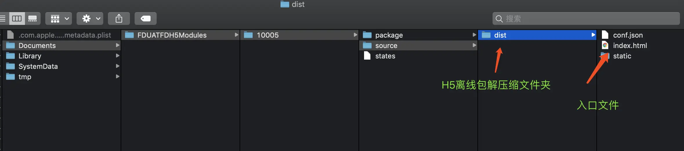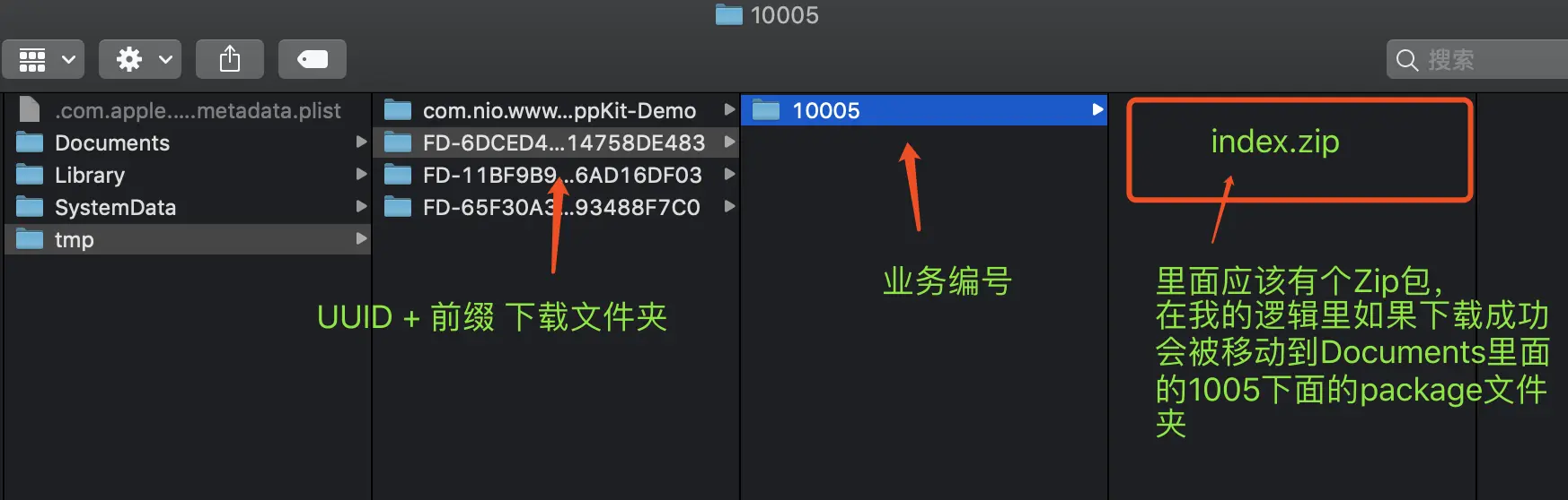 对 下面图片 说明: 首先会去服务器查询可用的离线包,然后拿到下载链接,将离线zip包下载到tmp文件夹下的FD+UUID的文件夹下,下面的目录用业务Key创建文件名字,里面装着离线H5 Zip包。 只不过图中的 已经被移动到Document文件目录下里了。