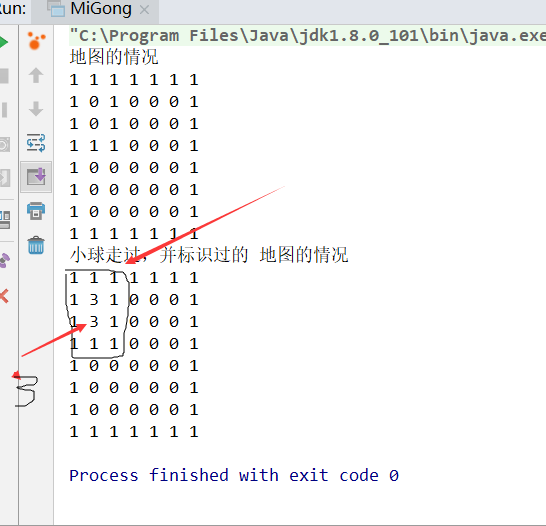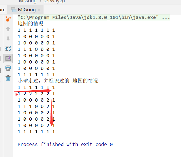 //4. 约定: 当map[i][j] 为 0 表示该点没有走过 当为 1 表示墙 ; 2 表示通路可以走 ; 3 表示该点已经走过,但是走不通