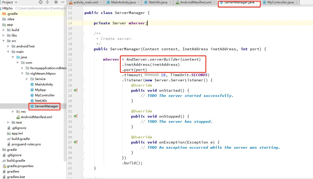 然后就是向 ServerManager 的构造函数传递 context,inetAddress,port 用来 new 对象,随后开启服务