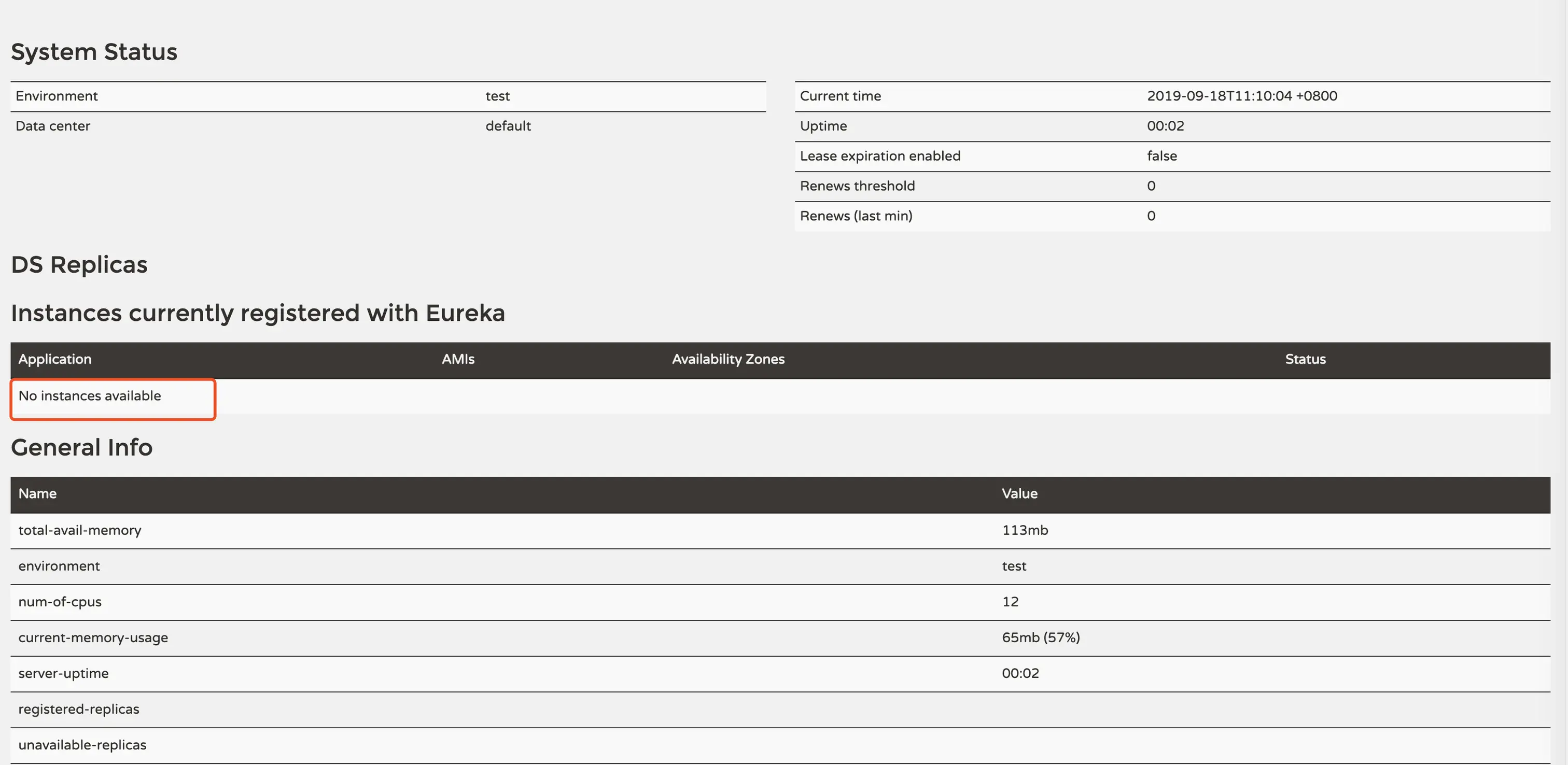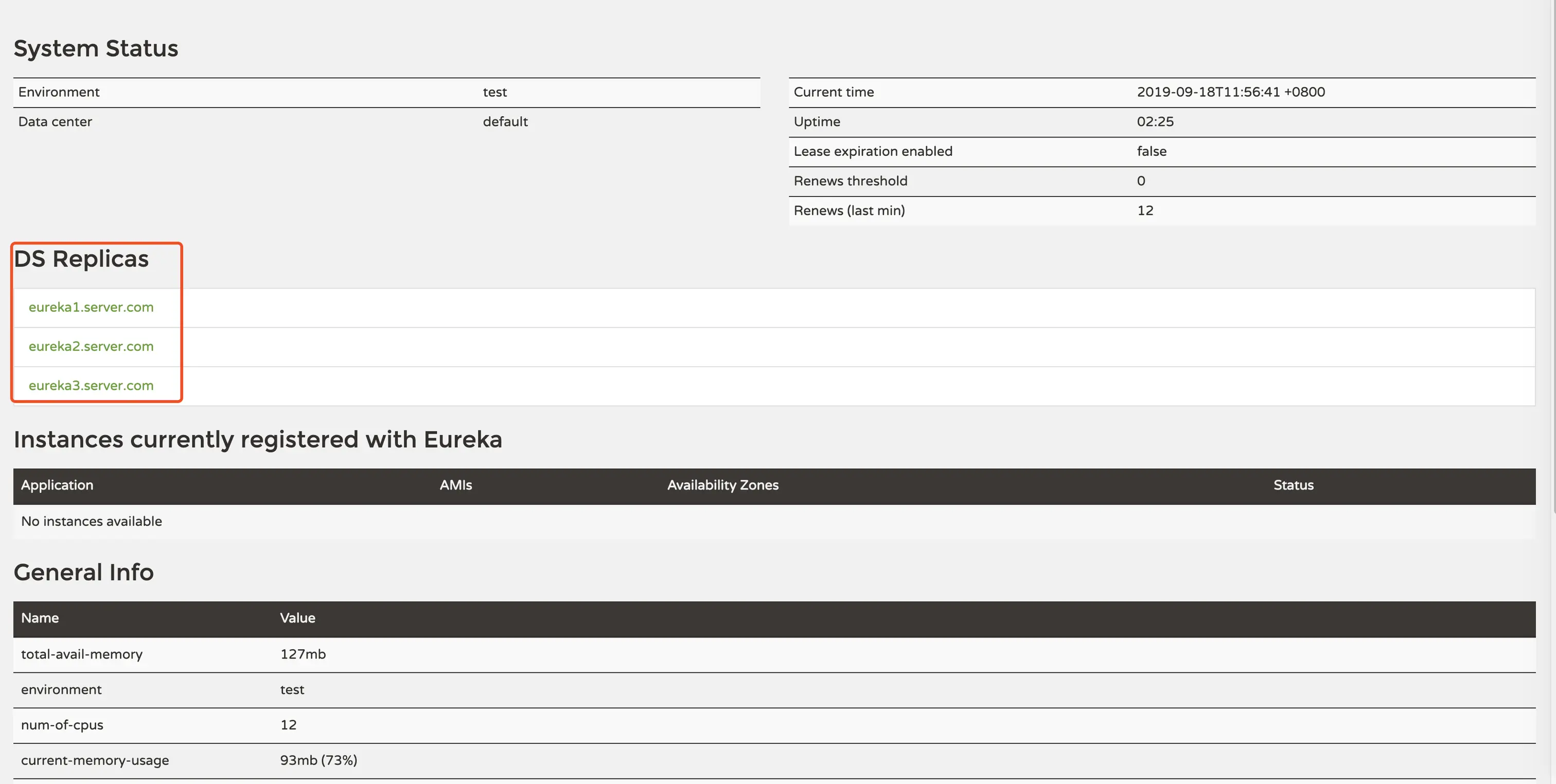 三个页面如上图显示就代表服务全部启动成功。至此,一个简单的服务中心集群就搭建完成。