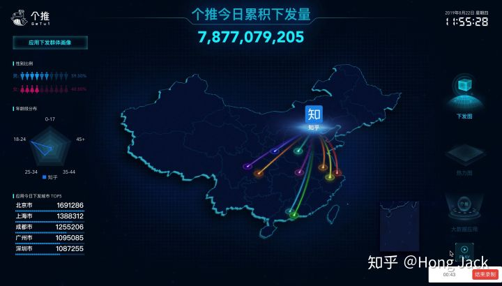 1) 个推消息下发图 实时展现了个推当天累计消息下发量、应用下发群体画像(包括性别比例、年龄段分布、当日应用下发城市Top5等)。