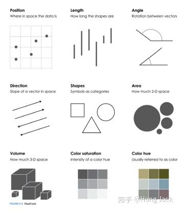 视觉暗示则是用来编码数据的元素,如位置、长度、大小、方向等。1985年,贝尔实验室发布了视觉元素的暗示排序清单。如清单所示,从上往下,大脑感知系统对这些符号、位置感知有不同的敏感程度,从最高到最低依次是:位置、长度、角度、方向、形状、面积/体积、色相与饱和度。