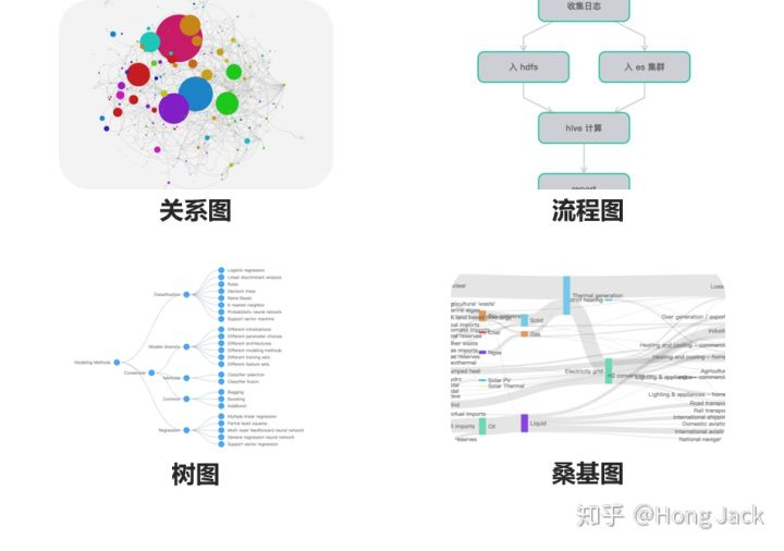 常用的关系数据图表有关系图、流程图、树图和桑基图。关系数据图表最重要的就是关系。从渲染层面来说,关系图存在两个最重要的难点:布局和聚类。布局意即如何分布要展现的数据,关系图、流程图、树图等,都只是布局不同;聚类则是要将真实的关系进行聚类模拟和可视化呈现出来,比如,哪些实体属于同一类别、相距比较近、或有从属关系等。