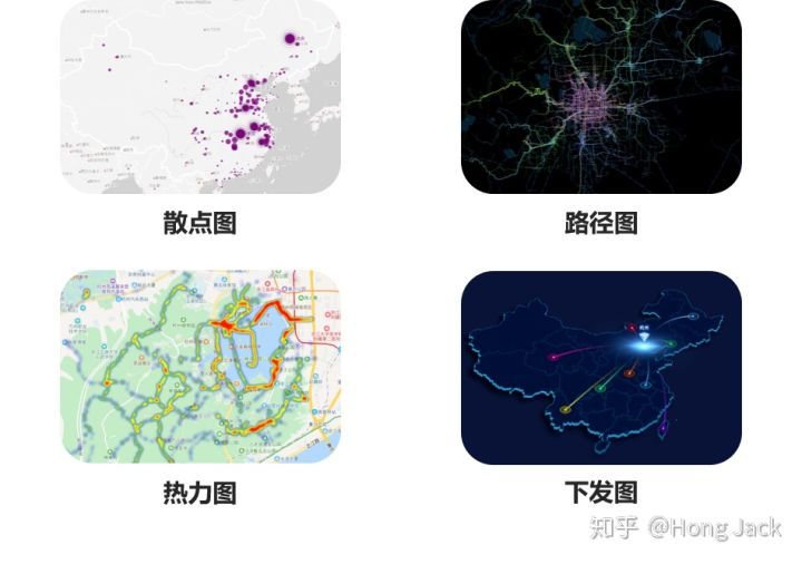 地理空间数据可视化图表有散点图、路径图、热力图、下发图等。地理空间数据图表的特点就是基于地理坐标系。