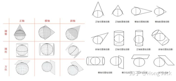 按照投影形式的不同,地图投影有圆锥投影、圆柱投影、方位投影三种;根据投影方向的位置又可以分为正轴投影、横轴投影、斜轴投影三种。这里要说的是,因为投影,地图就不可能被精准还原,投影展开后的平面地图肯定会有一个变形,根据变形又可以分为等角投影、等面积投影、任意投影等。