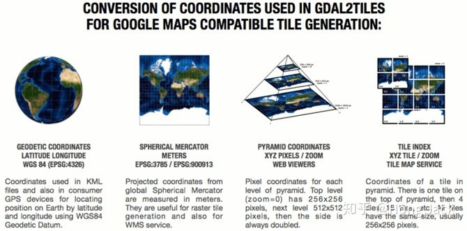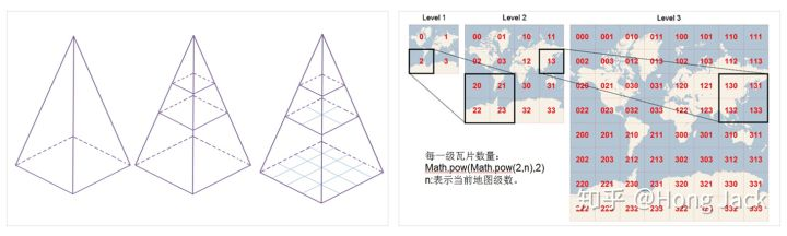 在最高级(zoom=0),需要的信息最少,只需保留最重要的宏观信息,因此用一张256x256像素的图片表示即可;在下一级(zoom=1),信息量变多,用一张512x512像素的图片表示;以此类推,级别越低的像素越高,下一级的像素是当前级的4倍。这样,从最高层级往下到最低层级就形成了一个金字塔坐标体系。