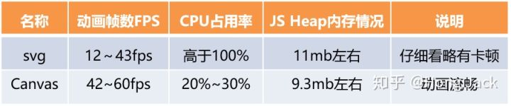 这里,我们将SVG和Canvas进行了性能对比:当飞行数量达到100时,SVG的动画帧数FPS只有12-43,CPU占用很高;Canvas则好很多,基本上是42-60FPS,CPU占用率是20%-30%,在内存占用等各方面都完胜。