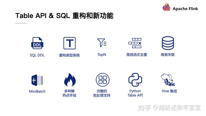 在Table API & SQL 重构和新功能部分,Flink在1.9.0版本中也Merge了大量从Blink中增加的SQL功能。这些新功能都是在阿里巴巴内部经过千锤百炼而沉淀出来的,相信能够使得Flink更上一层台阶。这里挑选了一些比较重要的成果为大家介绍,比如对于SQL DDL的支持,重构了类型系统,高效流式的TopN,高效流式去重,社区关注已久的维表关联,对于MinBatch以及多种解热点手段的支持,完整的批处理支持,Python Table API以及Hive的集成。接下来也会简单介绍下这些新功能。