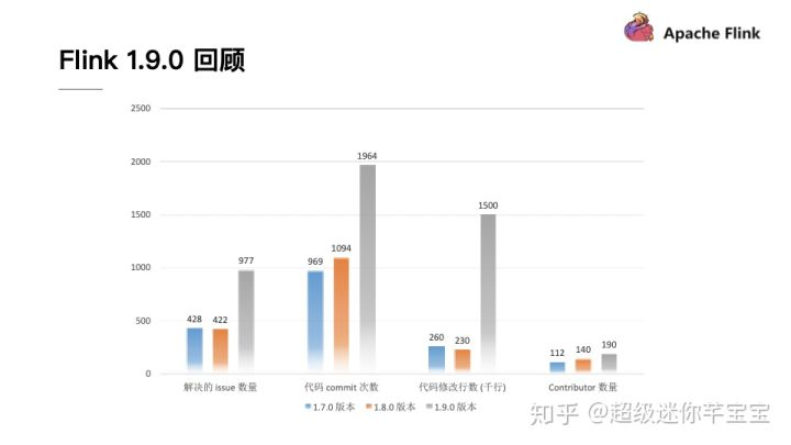 经过紧锣密鼓的开发,Flink 1.9.0不仅迎来了众多的中国开发者,贡献了海量的代码,也带来了很多的用户。从下图可以看出,无论是从解决issue数量还是从代码commit数量上来看,Flink 1.9.0版本超过了之前两个版本的总和。从代码修改行数来看,Flink 1.9.0达到了150万行,是之前版本的代码修改行数的大约6倍,可以说Flink 1.9.0是Flink开源以来开发者最为活跃的一个版本。从Contributor数量上也可以看出,Flink也吸引了越来越多的贡献者,并且其中很多的贡献者都来自于中国。此外,根据Apache官方所发布的开源项目活跃指标来看,Flink的各项指标也都名列前茅。