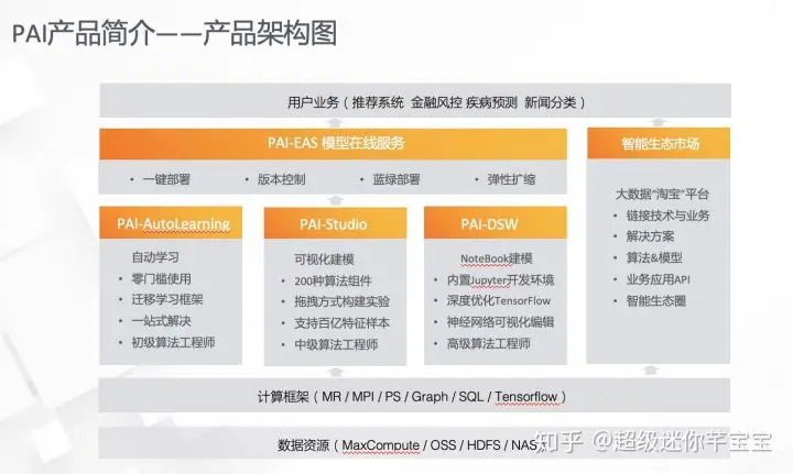 在PAI的架构图中,最下层的是PAI的计算框架和数据资源。PAI可支持MaxCompute、OSS、HDFS和NAS等多种数据资源。在数据资源和多种计算框架基础之上,诞生出了PAI的最早形态:PAI-Studio——可视化建模实验平台,Studio中包括了两百多种算法,覆盖了数据预处理,特征工程,模型训练,评估预测等全链路的实验流程操作。用户可在PAI-Studio中以拖拽的方式构建实验,而无需复杂的操作。此外,PAI内置了鲲鹏计算框架,可支持百亿特征,百亿样本的超大规模矩阵训练。在最初建立过程中,PAI-Studio的定位目标为中级的算法工程师,即一个不需要很高的技术门槛就可以上手使用的算法平台。有了可视化建模Studio,PAI就可以拥有为用户提供业务支持,如构建推荐系统、金融风控、疾病预测或新闻分类等的能力。