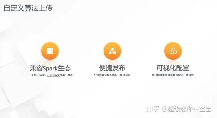 自定义算法上传包含三个特性。首先,自定义算法上传功能兼容Spark生态,支持Spark和PYSpark框架,在这个框架下用户可以任意开发自己所需要的算法。其次,自定义算法上传功能支持便捷发布。为了避免在自定义算法发布过程中,花费的精力大于最终带来的效率收益,PAI在自定义算法上传功能设计的过程当中,着重强调便捷发布,提供分钟级的算法发布体验。自定义算法上传第三个特性是可视化配置。从上传算法包,到真实的拖拉拽PAI-Studio中可使用组件,其中还包含一个步骤,既配置组件的算法参数以及相关配置。PAI为用户提供了可视化的在线操作配置的方式。