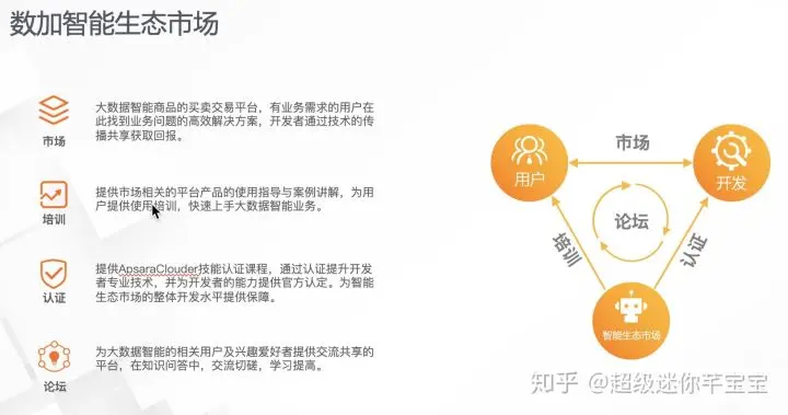 数加智能生态市场包括四大板块。首先,在市场板块中用户可以进行大数据智能商品的买卖交易。既有业务需求的用户可以找到业务问题的高效解决方案,开发者可以通过技术的传播和共享,获取回报和品牌效益。第二个板块是培训板块,培训板块可以提供市场相关平台的使用指导和案例讲解,为用户提供实用的培训,快速上手大数据的智能业务,实现快速入门。第三个板块是认证板块,主要面向开发者同学。在认证板块中开发者同学可以获取Apsara Clouder技能的认证证书,通过认证提升开发的专业技能,并获得官方资格的评定。第四个板块是论坛版块,大数据智能用户以及相关兴趣爱好者都可以在论坛相互交流,获取最新的前沿技术和知识。