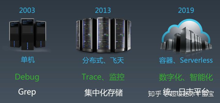 - 随着单机系统成为制约阿里业务发展的瓶颈,为了真正的Scale out,飞天项目启动:2013年飞天5K项目正式上线。在这个阶段各个业务开始了分布式改造,服务之间的调用也从本地变为分布式,为了更好的管理、调试、分析分布式应用,我们开发了Trace(分布式链路追踪)系统、各式各样的监控系统,这些系统的统一特点是将所有的日志(包括Metric等)进行集中化的存储。